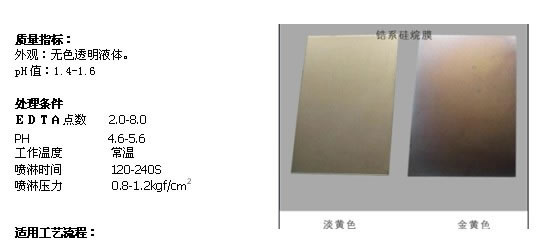 硅烷陶化處理劑是采用硅烷陶化技術(shù)開(kāi)發(fā)出的一種適合噴淋法等處理方法的無(wú)磷皮膜金屬處理劑,能在金屬表面形成金黃色*深紫色的金屬氧化物以及硅烷的復(fù)合保護(hù)膜。該產(chǎn)品形成的皮膜具有優(yōu)良的耐腐蝕性,能提高涂料的附著力,是**的涂裝前處理劑。本藥劑不含磷酸鹽,無(wú)鋅,無(wú)渣,常溫*作,節(jié)能環(huán)保。一般適合自動(dòng)清洗線與電泳前處理。